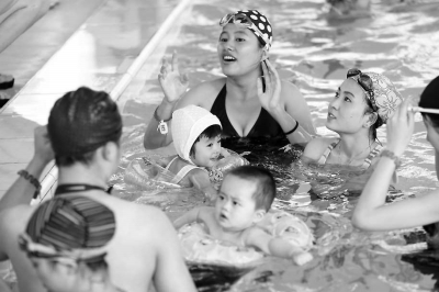 在市體育中心游泳館,小孩在大人的看護(hù)下,歡樂(lè)地嬉戲著。