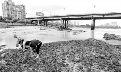 走到西溪邊上,記者發(fā)現(xiàn)因?yàn)樗幌陆?,西溪部分河道裸露出?lái),形成了大片灘涂。有10多名市民不顧危險(xiǎn),在灘涂上撿沙螺。