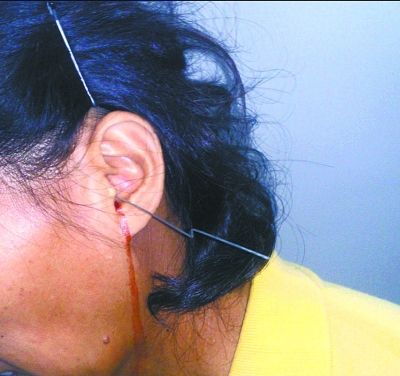 劉女士被傘骨穿耳,血流如注。