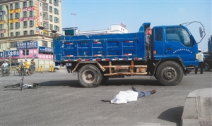 昨日上午8時許,一輛藍色的泥頭車在福海大道由西往東行駛,到永福路路口時,正好有一男子騎單車沿永福路左轉,被突然出現的泥頭車剮倒,單車被卷入車下,騎車男子被撞飛數米遠。目擊者介紹說,該男子“躺在地上一動不動,頭上流了好多血。”路人見狀報警,120救護車趕到現場,發(fā)現倒地男子已沒有生命跡象。記者在現場看到,肇事的泥頭車掛東莞牌照,其司機在警車內,接受交警詢問。