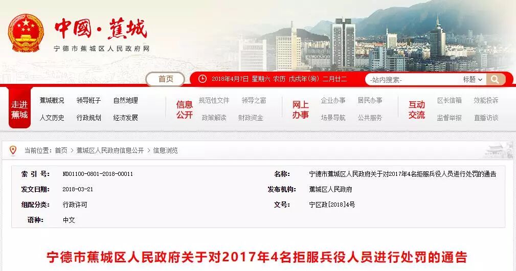 來(lái)自寧德市蕉城區(qū)人民政府網(wǎng)站消息,近日,蕉城區(qū)人民政府發(fā)布了關(guān)于對(duì)2017年4名拒服兵役人員的處罰通告,其中每人罰款人民幣五萬(wàn)元整,戶籍欄注明“拒服兵役”。