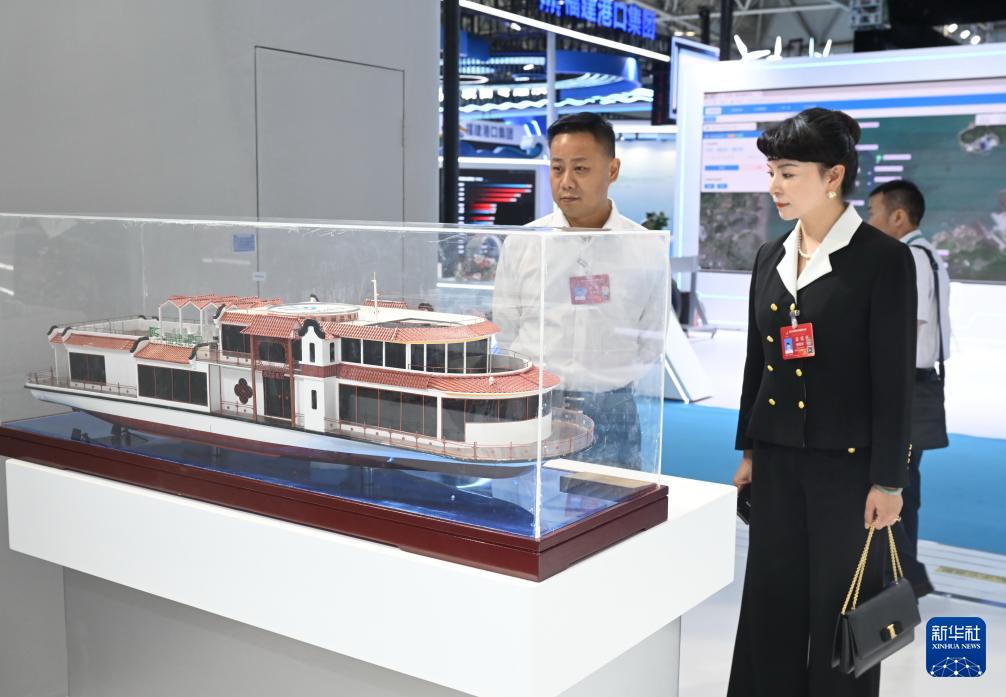 10月16日,與會人員在寧德時代展區(qū)觀看"閩江會客廳"電動游船模型。