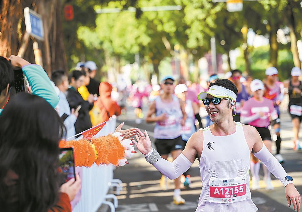 選手與賽道旁加油的觀眾擊掌。 福建日?qǐng)?bào)記者 施辰靜 攝