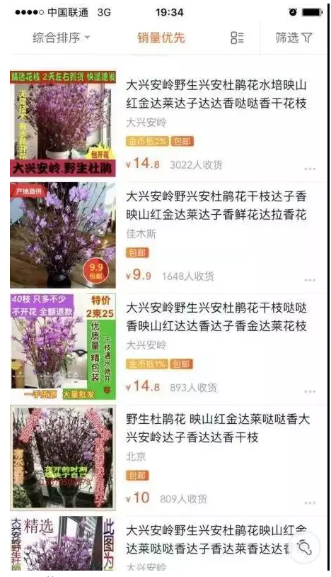 記者瀏覽某購物網(wǎng)站,“水培杜鵑、干枝、泡水開花、干柴枯木逢春花”這些關(guān)鍵詞下面配的圖,均是興安杜鵑花,還有店家特地加上了“人工培育”和“自家種植”的字樣。只有極少的店家還在產(chǎn)品描述里寫“興安杜鵑干枝”。