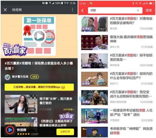 在《百萬贏家》各類答題場上,獲得百萬獎金的只占少數(shù),更多的答題者活躍在眾多直播答題場,瓜分數(shù)十甚至上百網(wǎng)獎金。為提高這些競答賽場的通關(guān)率、幫助更多網(wǎng)友順利闖題關(guān)分獎金,每場《百萬贏家》(除“血戰(zhàn)到底”)開始前1小時,快視頻都會發(fā)布一條深藏機密、知識趣味十足的短視頻,這條短視頻將獨家提供1道《百萬贏家》(除“血戰(zhàn)到底”專場)的答題線索??煲曨l的神助攻,不但提高了答題的容錯率,還能推動真正意義的全民參與、全民科普和全民狂歡的實現(xiàn)。