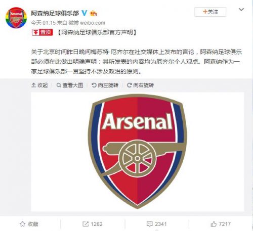 關(guān)于北京時(shí)間昨日晚間梅蘇特·厄齊爾在社交媒體上發(fā)布的言論,阿森納足球俱樂(lè)部必須在此做出明確聲明:其所發(fā)表的內(nèi)容均為厄齊爾個(gè)人觀(guān)點(diǎn)。阿森納作為一家足球俱樂(lè)部一貫堅(jiān)持不涉及政治的原則。