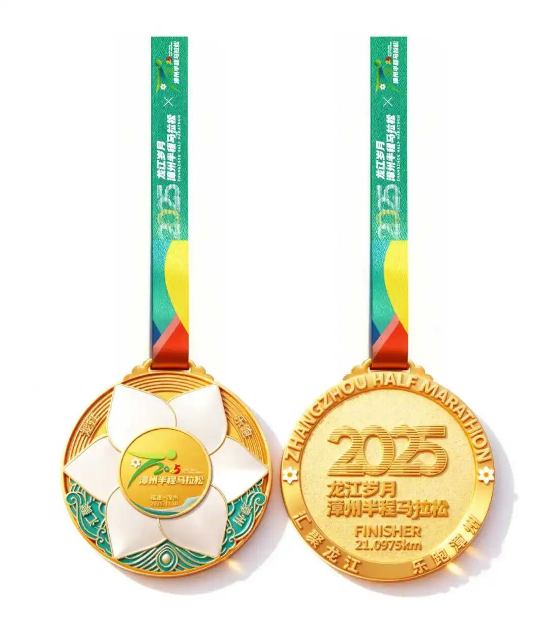 潔白的花瓣層疊舒展,中央是龍江歲月的標(biāo)識與賽事信息,底部流淌著波光粼粼的藍綠色水紋,背面鐫刻著"2025龍江歲月·漳州半程馬拉松 FINISHER 21.0975km"。