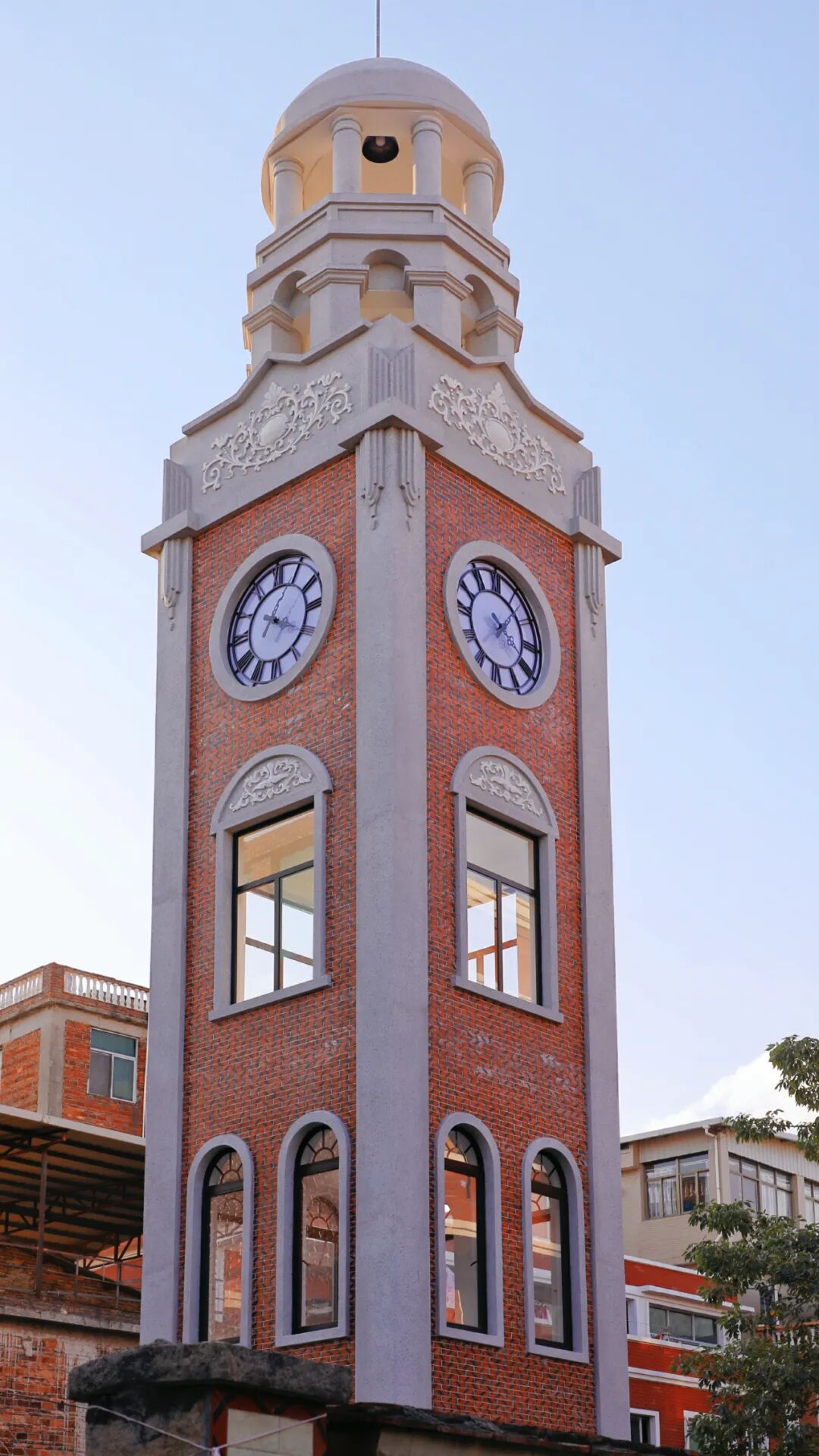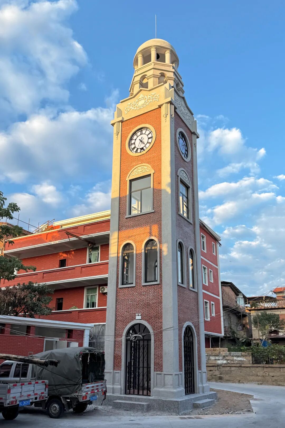 步入街區(qū),一座七層高的塔樓矗立于西側(cè),挺拔而醒目。這座塔樓融合了傳統(tǒng)樓閣的典雅形制與僑鄉(xiāng)文化元素,采用南洋風格鐘樓造型,結(jié)構(gòu)精巧、造型典雅。外立面巧妙運用閩南紅磚與雕花裝飾,細節(jié)之處盡顯閩南古韻與南洋風情。塔樓不僅在形態(tài)上延續(xù)了傳統(tǒng)樓閣之美,更通過細部裝飾承載起深厚的僑鄉(xiāng)記憶,成為連接歷史與當代、鄉(xiāng)土與海外的重要視覺與文化符號。