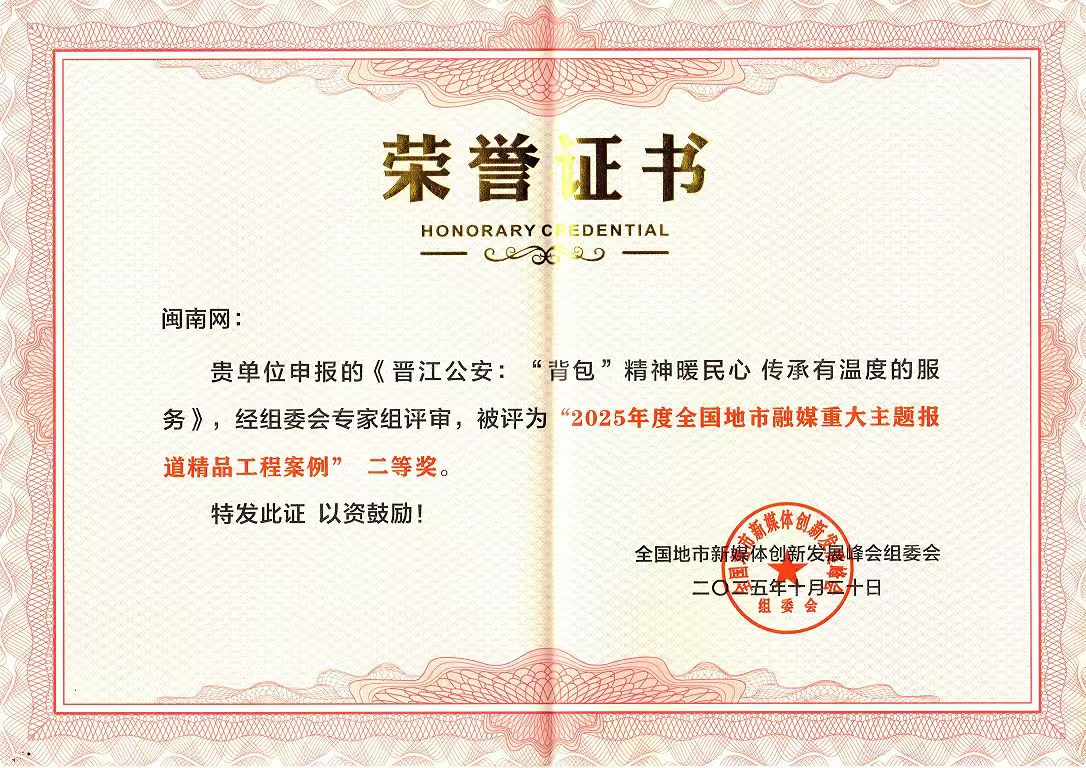 閩南網(wǎng)10月30日訊(閩南網(wǎng)記者 尤燕姿)近日,閩南網(wǎng)報送的《晉江公安:“背包”精神暖民心 傳承有溫度的服務(wù)》融媒報道被評為“2025年度全國地市融媒體重大主題報道精品工程案例”二等獎。該獎項(xiàng)對該報道給予了積極的肯定,同時也是褒揚(yáng)晉江公安“背包”精神踐行時代使命的寫照。