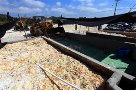 這處洗布作坊規(guī)模不小,數百平方米的場地內,大量堆放或攤曬著漂白后的碎布條,在陽光的曝曬下散發(fā)出濃烈的酸臭,令人不禁掩鼻。該洗布作坊內有四口酸洗池,池內還浸泡著不少半成品,越靠近酸臭味更加濃烈;每口酸洗池都有一處排污口,黃色的生產廢水從排污管道流出,未經處理直接排向山下,在山下水坑處激起厚厚的泡沫……