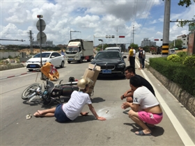 車禍現(xiàn)場,道路中央隔離帶處交通安全防撞桶已被撞爛,道路維修警示的臨時錐形筒散落一地,前方一摩托車車主倒地不起,后方一輛寶馬轎車急停,引發(fā)一面包車追尾。據(jù)摩托車車主介紹,他通過紅綠燈后正常行駛,后方轎車快速駛?cè)耄顾采辖煌ò踩皩?dǎo)致車禍。對此,轎車車主并不認(rèn)同,他表示,自己并未與摩托車車主發(fā)生接觸,摩托車車主變道時撞向交通安全桶可能是由于附近施工殘留沙土打滑所致。事故具體原因有待交警部門作進(jìn)一步調(diào)查。