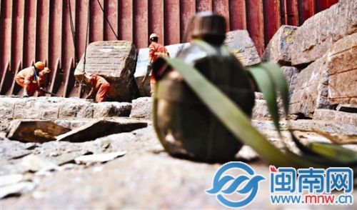 工人們合作默契,為幾十噸重的巨石套上鋼繩,準(zhǔn)備起吊