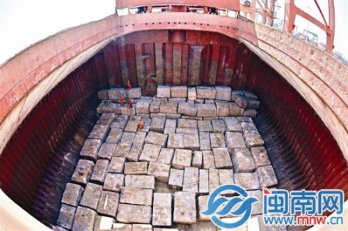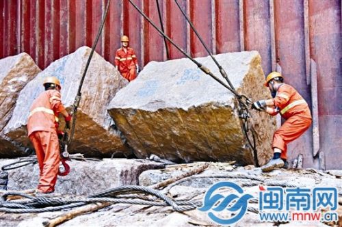 巨大的船艙,40℃的高溫,工人們就在里頭一塊塊吊運(yùn)石料