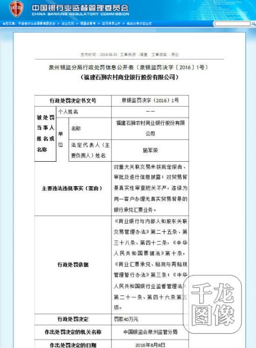 按《商業(yè)銀行與內(nèi)部人和股東關(guān)聯(lián)交易管理辦法》第二十五條、第三十八條、第四十二條,《中華人民共和國票據(jù)法》第十條,《商業(yè)匯票承兌、貼現(xiàn)與再貼現(xiàn)管理暫行辦法》第三條;《中華人民共和國銀行業(yè)監(jiān)督管理法》第二十一條、第四十六條第五項(xiàng)的相關(guān)規(guī)定,中國銀監(jiān)會(huì)泉州監(jiān)管分局作出罰款40萬元決定。作出處罰決定的日期為2016年8月8日。