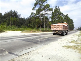 在通往鵬山工貿(mào)學(xué)校的路上,記者發(fā)現(xiàn)此處路面“滴灑漏”現(xiàn)象突出。有些路面還因?yàn)槌D甑哪p,摻在里面的砂石部分已經(jīng)暴露在表面,成了“磨砂路”。記者現(xiàn)場(chǎng)觀察,此處道路狹窄,兩旁缺乏綠化帶草叢,砂石本來(lái)就多。而一些經(jīng)過(guò)的土方車還會(huì)由于裝載過(guò)多,導(dǎo)致車上砂石灑漏,另外加上清掃工作的不及時(shí),多種原因形成了“磨砂路”的出現(xiàn)。而當(dāng)車輛經(jīng)過(guò)時(shí),如果壓到尖銳的石塊易造成扎胎而損壞車輛,緊急情況剎車時(shí)也容易導(dǎo)致滑車現(xiàn)象,為車輛安全出行埋下隱患。