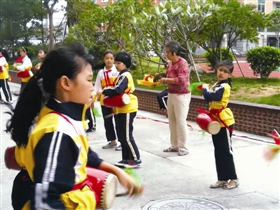 “手要抬高點(diǎn),動(dòng)作要干凈有力,步伐也要與手協(xié)調(diào)……”椅奇妙正在學(xué)校里給孩子們傳授腰鼓、軍鼓技藝,耐心地糾正每個(gè)孩子的動(dòng)作。面對(duì)這位溫和、慈祥的老人,孩子們聽得十分認(rèn)真,都用心地學(xué)習(xí)。