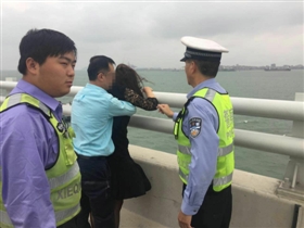 民警立即進(jìn)行安全布控。據(jù)了解,兩人是夫妻關(guān)系。丈夫是外地人,但已在石獅工作多年。妻子是石獅人,兩人結(jié)婚多年,已經(jīng)生育小孩。近期夫妻倆因感情問(wèn)題一直發(fā)生爭(zhēng)吵。當(dāng)日,兩人外出辦事,妻子駕車(chē)返回石獅。在經(jīng)過(guò)泉州灣大橋時(shí),夫妻倆又在車(chē)內(nèi)發(fā)生激烈的爭(zhēng)吵。妻子非常激動(dòng),也不管是不是在高速路上,把車(chē)一停,拉開(kāi)車(chē)門(mén),幾步?jīng)_到泉州灣大橋的防護(hù)欄處,爬上鐵欄桿,想跳海輕生。丈夫急忙沖到身旁,緊緊將妻子抱住,不停地勸說(shuō)。兩人已經(jīng)在護(hù)欄邊僵持了好幾分鐘。