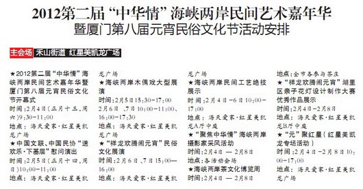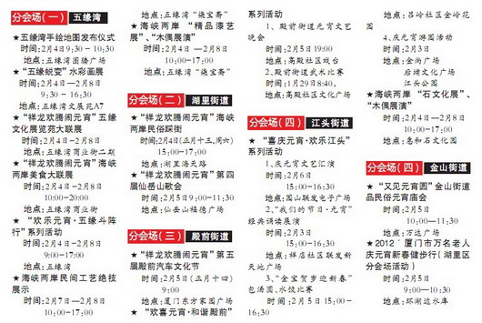 據(jù)廈門商報報道 廈門第八屆元宵民俗文化節(jié)將于2月4日(星期六)在湖里區(qū)舉行。當天14:30至17:30,海天路(長岸路口至華泰路口段)、華嘉路(南山路口至宜賓路口)、華昌路(南山路口至興隆路口段)、海天支路(南山路口至竹坑路口段)采取雙向封閉,禁止機動車輛通行。同時,記者從市運管處了解到,另外還有20條公交線路將臨時調(diào)整,交通管制解除后,再恢復原線路運行。